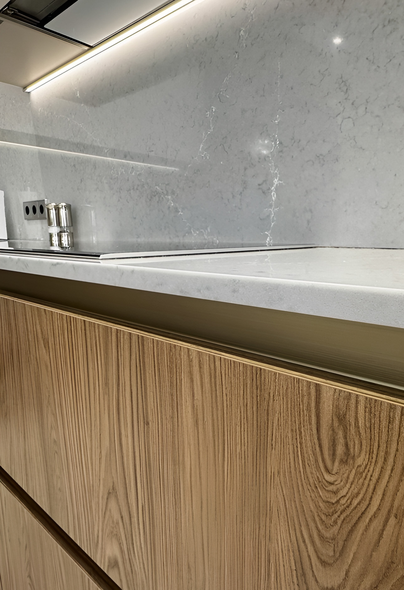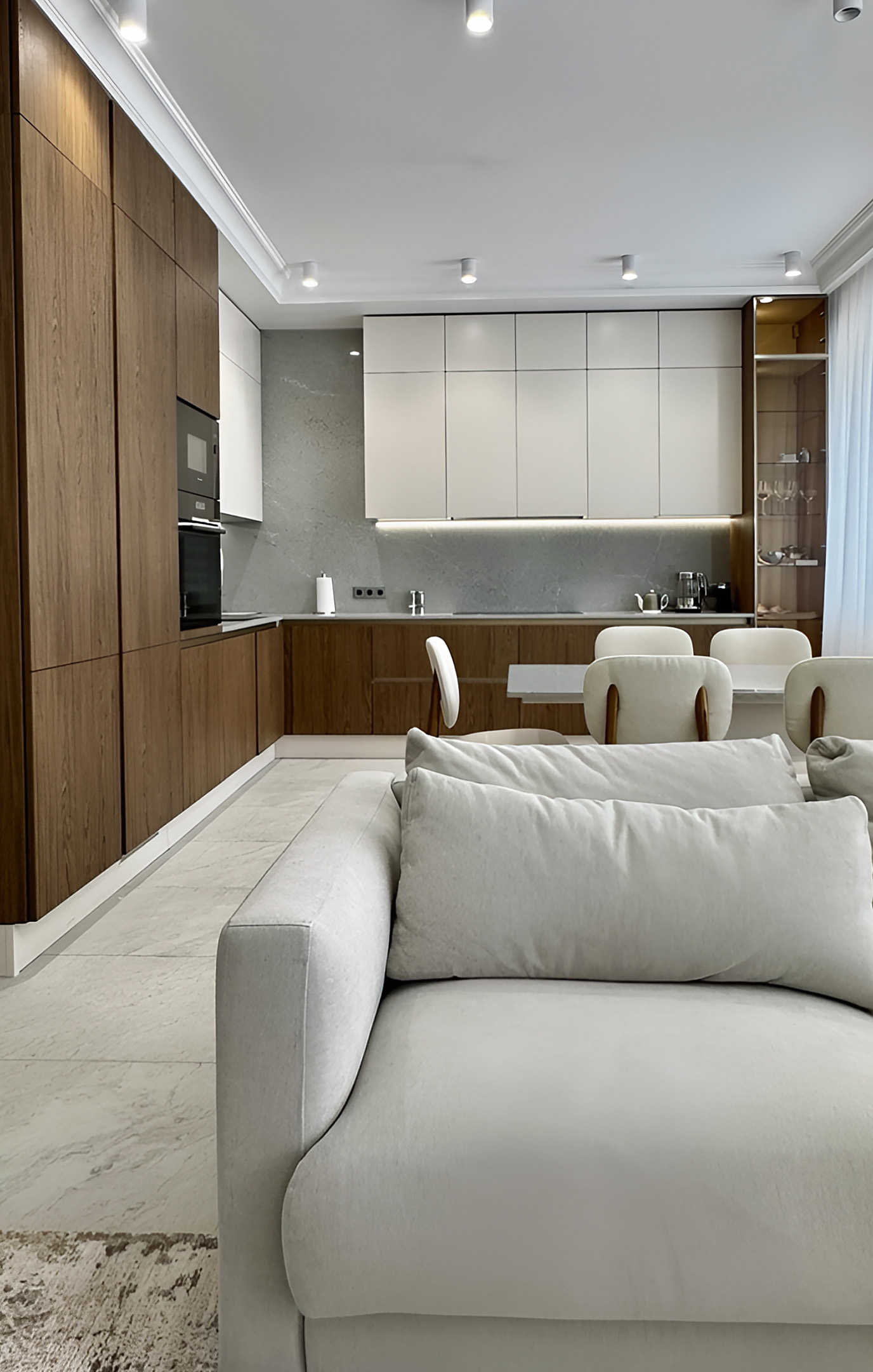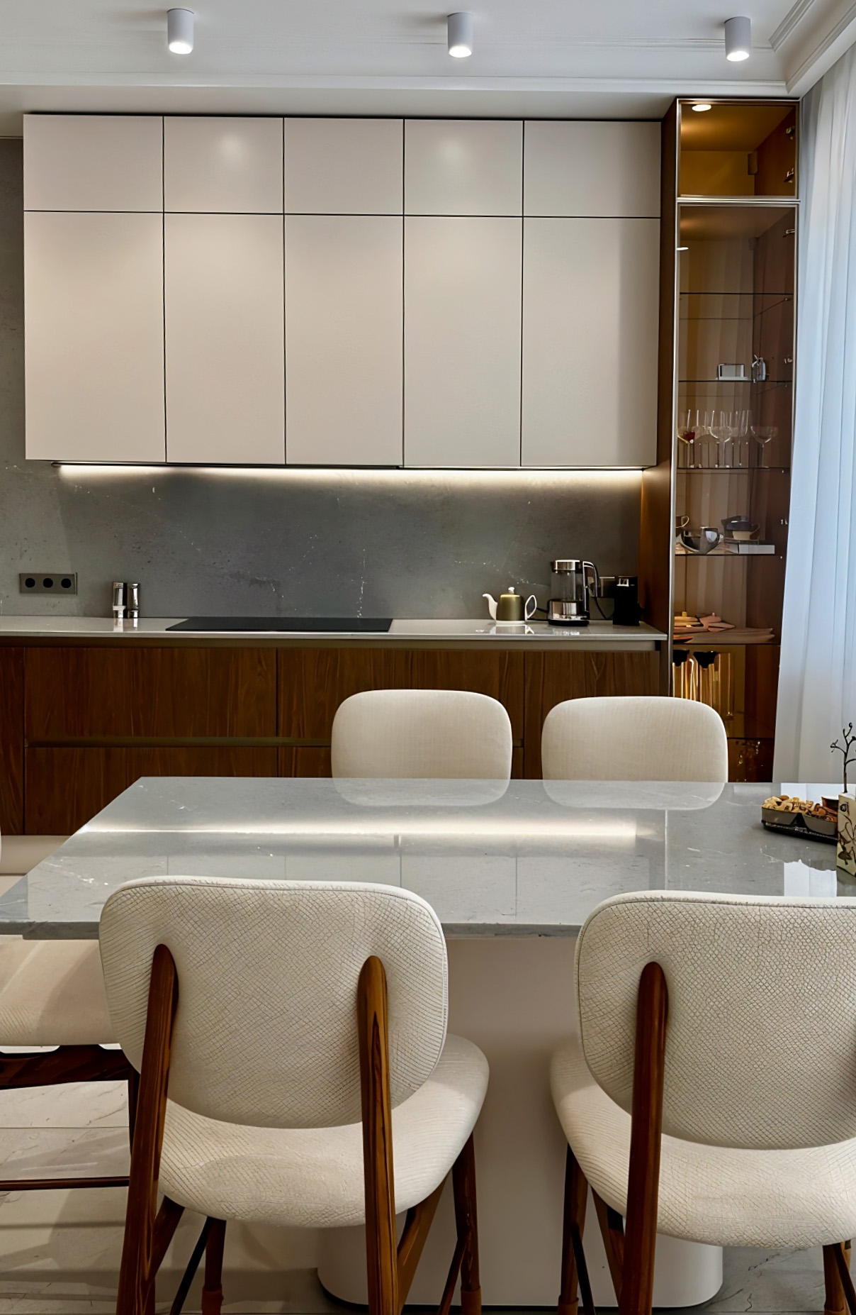 Особое внимание уделили техническому оснащению и эргономике. Чтобы сохранить чистоту линий и единство стиля, в мебель были интегрированы два встраиваемых холодильника. Акцентным элементом интерьера стала изящная колонна со стеклом и встроенной подсветкой — она не только служит эстетичной витриной для посуды, но и создает мягкий вечерний сценарий освещения. Продуманная система хранения позволила эффективно использовать каждый сантиметр, обеспечив идеальный порядок на рабочих поверхностях.